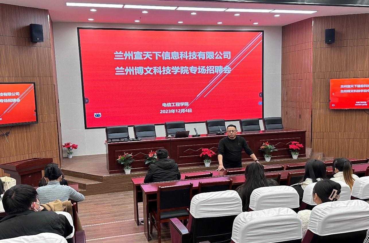 2023年12月4日下午,电信工程学院邀请兰州宣天下信息科技有限公司为我校数字媒体技术、物联网工程、网络工程等相关专业毕业生举办了一场专场招聘会,企业为毕业生提供了众多优质岗位,吸引了相关专业毕业生前来参加。