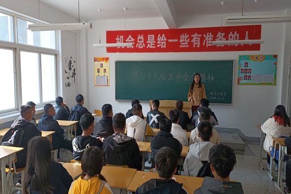 首先,陶老师就此次大会召开的背景向同学们做了介绍,中央委员会总书记习近平代表中央政治局向全会作工作报告,并就《中共中央关于制定国民经济和社会发展第十四个五年规划和二〇三五年远景目标的建议(讨论稿)》向全会作了说明。随后,陶老师表示,作为高校教师,要把学习宣传贯彻党的十九届五中全会精神作为当前重要政治任务抓紧抓好,同“四史”学习教育相互融合互为贯通,推动学习贯彻往深里走,往实里走,取得更好成效。要从风险挑战中增强危机感、从抗“疫”战果中增强自信心、从政策利好中抢抓新机遇,更加自觉地在“两个大局”下辨大势、找方向,准确识变、科学应变、主动求变,坚持用全面、辩证、长远的眼光看待当前的困难、风险、挑战,深刻把握危机共生、危中蕴机、危可转机的辩证关系,善于在危机中育先机、于变局中开新局,抓住机遇,应对挑战,趋利避害,奋勇前进,始终保持战略定力,全面增强必胜信心。最后,陶老师告诫我们,作为当代大学生,我们要保持战略定力,在学习、工作中以解决同学们的实际问题为导向,增强“四个意识”、坚定“四个自信”、坚决做到“两个维护”;思想上始终与党中央保持高度一致。我们要拿出顽强的意志与韧劲,迎难而上、乘风破浪,扎根于专业知识的学习和技能的掌握,为祖国和人民奉献我们的青春力量。