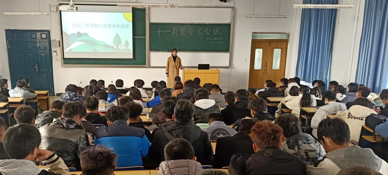 为规范学生宿舍管理,培养我院学生的宿舍用电安全意识和卫生习惯,营造安全舒适的宿舍氛围。2021年11月30日,bat365正版唯一官网电信工程学院在南校区教学楼西T2召开了2021年11月宿舍长会议,此次会议的主持人为学生辅导员李彩弟,参加会议的人员有电信工程学院21级全部宿舍长。