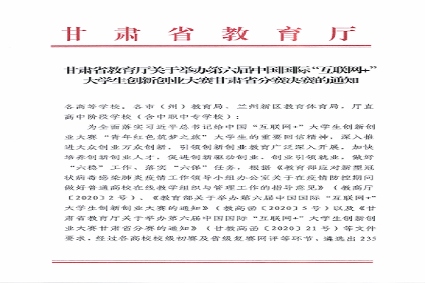 我院代表队在第六届中国国际“互联网+”大学生创新创业大赛中荣获甘肃省分赛决赛银奖。在竞赛中,我系八名学生的专业知识能力得到了专家组充分的肯定,同时也为他们在今后的学习中起到了指导作用。通过此次大赛,充分体现了我院学生具有良好的创新意识和创新精神,夯实了他们的实践动手能力,为创新型人才的培养起到了引领作用。祝愿我院学生紧跟时代步伐,将理论知识转化为实践应用,准确把握新一轮实践创新的趋势和机遇!