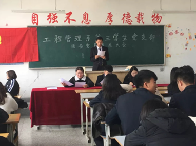 2018年11月16日星期五中午12:40,工程管理系学生第三党支部转正大会在5006教室顺利召开,工程管理系第三学生党支部副书记张世宁,支部委员徐圆圆、冉心阳、富晓拴、徐超儿、各班团支书、支部正式党员、预备党员以及各班积极分子出席大会。 此次会议由支部副书记张世宁主持。大会伊始,支部副书记张世宁同志进行会议人数的清点,并宣布了党员到会情况。随后转正大会在宏亮的国歌声中正式拉开帷幕。