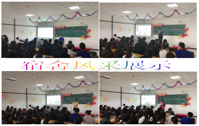 首先由获奖的各个宿舍代表上台分别介绍他们的宿舍风采。精彩的解说词,给我们展现了一个个温馨的宿舍,温馨的家。解说词中写道:“虽然我们来自五湖四海,虽然我们以前并不认识,但我们有缘住在一起,那么宿舍就是我们的第二个家,里面有我们的家人”。看着一张张优美的照片,听着一个个温馨的故事,我们感受了舍友之间的情谊,也看到了他们对大学美好生活的向往,让到场的所有观众身临其境,沉浸在每一间小屋温馨美好的氛围里。