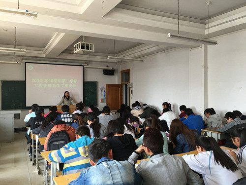 2016年4月21日中午12:20,工程管理系在教学楼1021教室召开2015-2016学年第二学期期中教学检查学生座谈会,参加本次座谈会的有工程管理系刘影教学副主任、系教学秘书及各级各班学生代表。