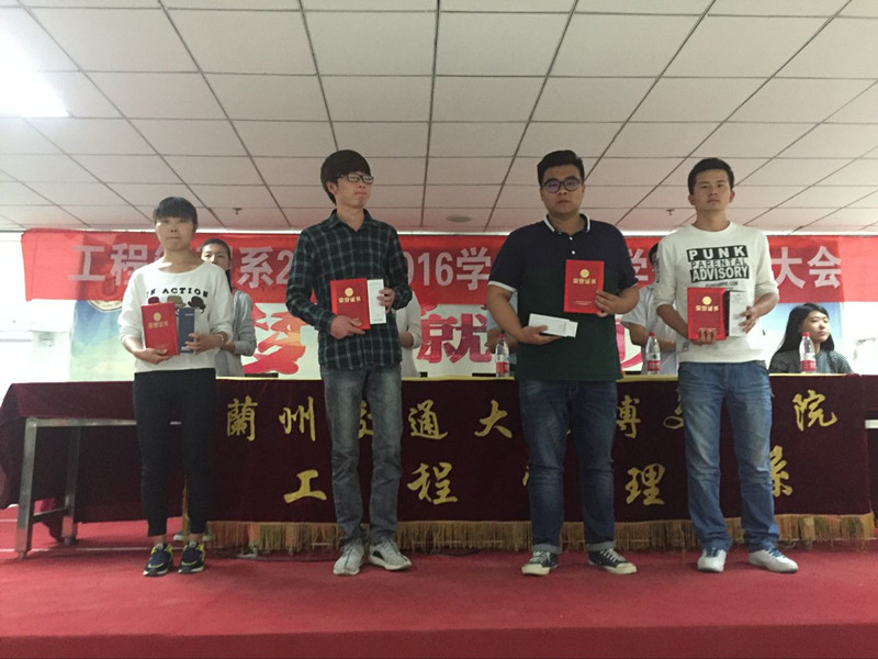 本次大会表彰了我系考取2016年研究生、省级三好学生、我系优秀毕业生、优秀班干部及院级优秀毕业生、工程管理系代表我院参加全国中、高等院校学生“斯维尔杯”建筑信息模型(BIM)应用技能大赛获奖学生、兰州交通大学博文学院第三届测量技能大赛获奖学生,并为各奖项获得者颁发了证书及奖品。叶国仁主任希望全体同学,以受表彰的同学为榜样,树立远大的理想,明确奋斗的目标,为建设良好的系风、学风、班风,营造良好的校园文化氛围做出努力。