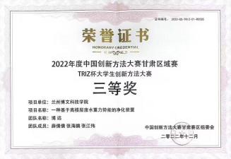 在甘肃省科协、甘肃省科技厅指导下,由甘肃省创新方法研究会、甘肃省科技发展促进中心联合承办的2022年中国创新方法大赛甘肃区域赛企业专项赛;甘肃省创新方法研究会、甘肃省科技发展促进中心联合承办、兰州理工大学创新创业学院协办的2022年甘肃省大学生创新方法大赛暨大学生TRIZ杯大赛中,我校工程管理学院教师魏永键,学生薛倩倩、张海鹏、张江伟代表我校参加竞赛,以项目“一种基于高楼层废水重力势能的净化装置”荣获三等奖。