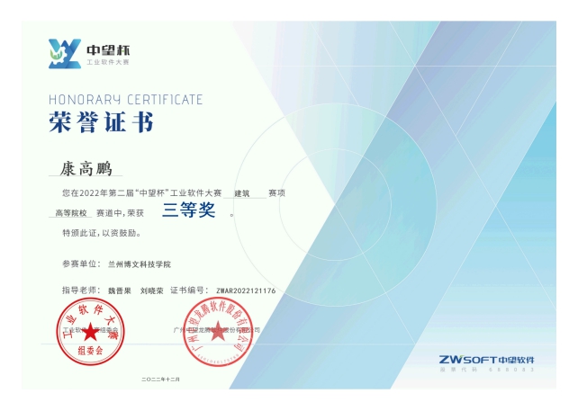 由工业软件创新合作中心、广东省工业软件创新中心指导,广州中望龙腾软件股份有限公司主办,华南理工大学承办,以关键核心技术“更稳定、更强大、更安全”为主题的第二届“中望杯”工业软件大赛,高等院校赛道建筑组竞赛于2022年12月3日举行,我校工程管理学院买克强、康高鹏等四位同学代表我校参加竞赛,并荣获三等奖。