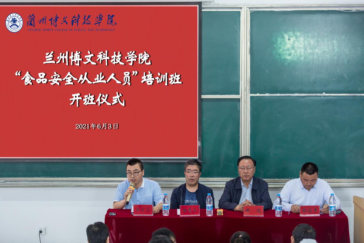 2021年6月3日下午,我院“食品安全从业人员”培训班开班仪式在南校区教学楼东T3室顺利举行。学院陈彪院长、郭宝军副院长、榆中县市场监督管理局干部王卫东同志、高云霞同志出席开班仪式,后勤处全体工作人员、餐饮公司经理及食堂全体从业人员共计100余人参加了本次培训,开班仪式由后勤处处长张宏亮主持。本次培训特别邀请到了榆中县市场监督管理局餐饮股滕慧文股长为食堂全体从业人员作了《餐饮服务食品安全操作规范宣传册》解读专题讲座。