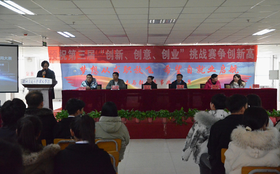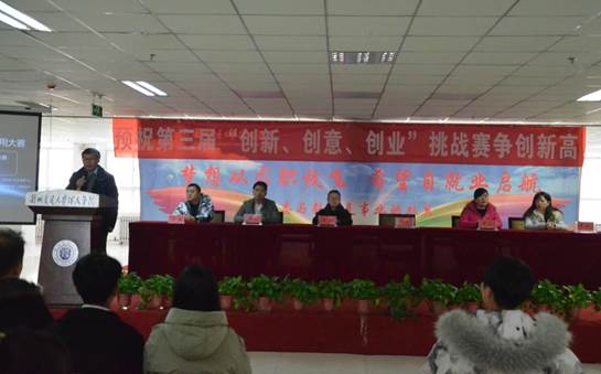 在本次大赛的开幕式中,胡彦奎院长为大赛致辞。胡院长借用培根的两句名言---“知识就是力量”和“实践是科学的皇后”,强调知识和实践是创新的两个重要方面,同时要求相关部门要一如既往的做好创新创业教育工作,切实培养学生的创新精神和创新能力。最后胡院长祝愿所有参赛队能取得好成绩,并预祝本次大赛圆满成功。