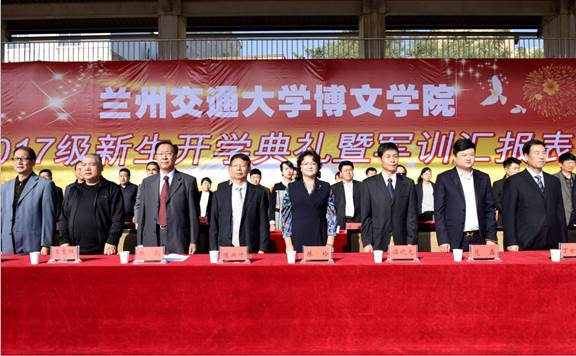 秋高气爽,丹桂飘香。9月15日上午9时,兰州交通大学博文学院2017级新生开学典礼暨军训汇报表演在体育场隆重举行。兰州交通大学副校长陈兴冲、党委办公室副主任刘欣、教务处副处长马镭、财务处处长高虎、学生处副处长李瑞、招生就业处副处长冯鑫;承训部队领导;学院董事长陈玲,院长陈彪,党委书记温晓光,党委副书记、常务副院长王吉祥,执行院长范磊,副院长左闯,党委副书记丁世俊,副院长刘彦凯、王明刚、胡彦奎等院领导和各处(室)、系(部)的负责人出席典礼并在主席台就坐。典礼由学院胡彦奎副院长主持。