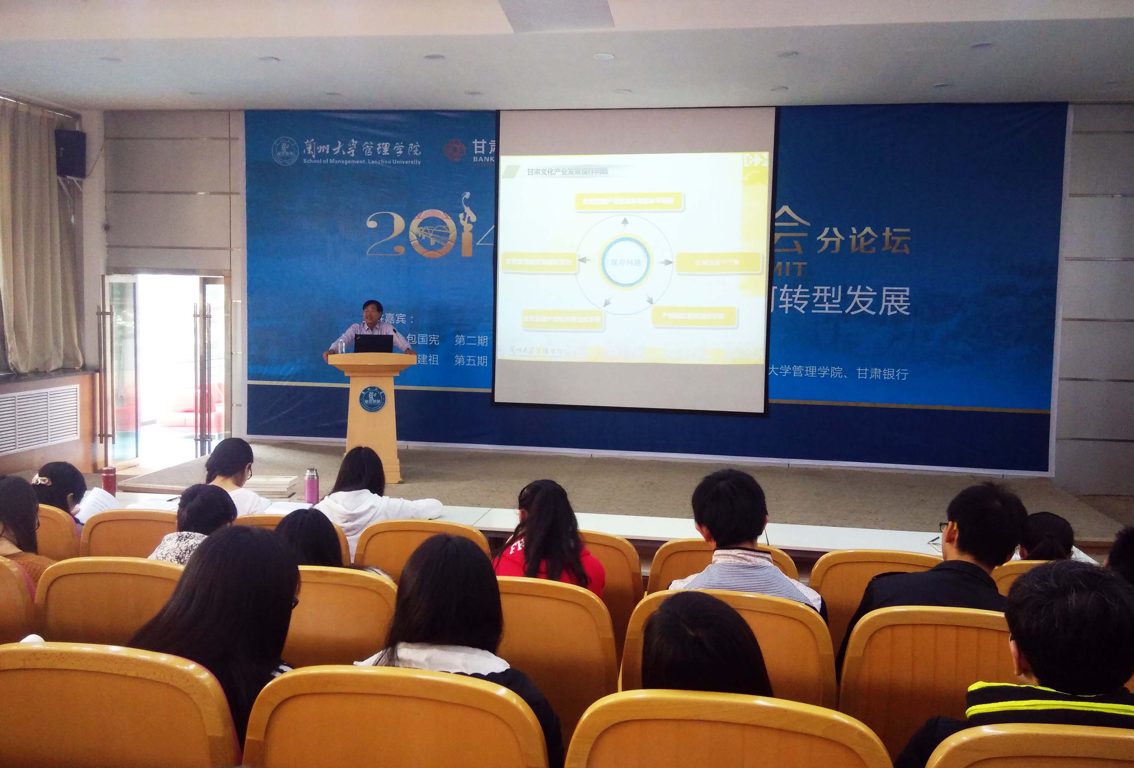 2015年11月28日下午,兰州交通大学博文学院艺术设计系副主任秦维财同志组织艺术设计系师生参加了在兰州大学举办的2014年金城峰会论坛分论坛——甘肃省文化产业资源与产业化发展专题报告会。本场专题报告由甘肃文化资源与产业化发展课题组组长、兰州大学经济管理学院教授、硕士生导师李映洲担任主讲。
