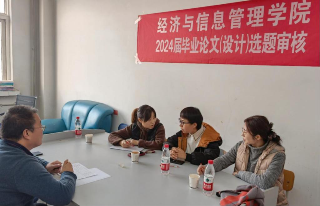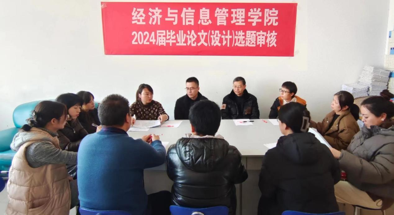 为了规范 2024 届本科毕业论文(设计)管理工作,保证毕业论文(设计)的整体质量及正常开展。近日,我校经济与信息管理学院在南校区教学楼1022办公室召开了关于2024届毕业生论文(设计)选题审核工作会议。此次会议根据2024届毕业论文(设计)选题征集情况,成立了 2024 届毕业生论文(设计) 选题审核小组,对毕业论文(设计) 选题进行细致审核。会议由经济与信息管理学院院长张利主持,教学管理副院长陈学红、客座教授王娟娟、学科带头人孔陇教授、本校王定科教授、王文亮副教授以及本院各教研室主任及其他专业对口副教授等16人参加会议。