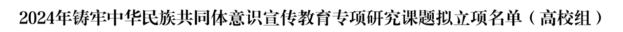铸牢中华民族共同体意识宣传教育专项研究课题是深入贯彻落实党的二十大精神和中央民族工作会议精神,围绕学校铸牢中华民族共同体意识宣传教育开展的研究。两项课题围绕构建民族共享文化符号的认同展开,研究民族文化的传承保护和创新交融,是深刻认识和把握铸牢中华民族共同体意识的历史必然性,积极引导各族师生牢固树立“四个与共”共同体理念,不断增强“五个认同”意识,推动铸牢中华民族共同体意识宣传教育常态化,为中华民族共同体意识提供智库支持和方案。
