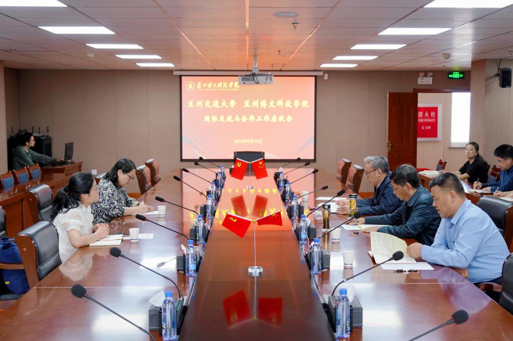 9月19日下午,我校与兰州交通大学国际交流与合作工作座谈会在培训楼8楼会议室会举办。兰州交通大学国际交流中心(港澳台事务办公室)主任、国际教育学院院长张国锦,综合服务与引智服务科科长李敏,我校校长陈正武、副校长郭宝军、教务处处长邢刚、人事处处长王定科和各二级学院院长参加。会议由陈正武主持。