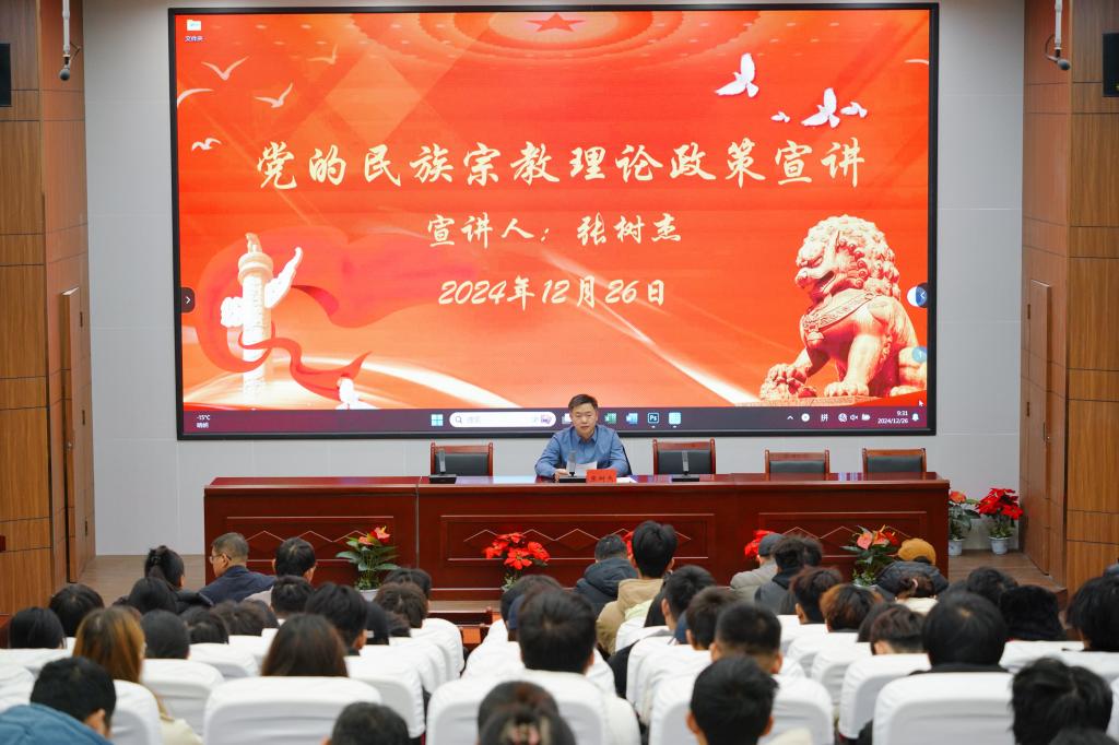 为全面贯彻党的二十大及二十届二中、三中全会精神,深入学习习近平总书记关于加强和改进民族工作的重要思想、关于宗教的重要论述,全面落实中央关于民族工作的决策部署和甘肃省委有关工作要求。按照省委统一战线工作(民族宗教工作)领导小组统一安排,12月26日上午,我校举办了党的民族宗教理论政策宣讲活动。本场宣讲由甘肃省民委党组成员、副主任张树杰对党的民族宗教理论政策进行解读。学校党委书记阳红、党委办公室负责人、校团委书记、辅导员、班主任及学生代表等200余人参加。