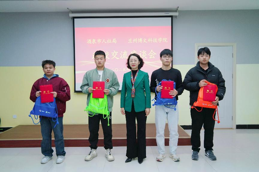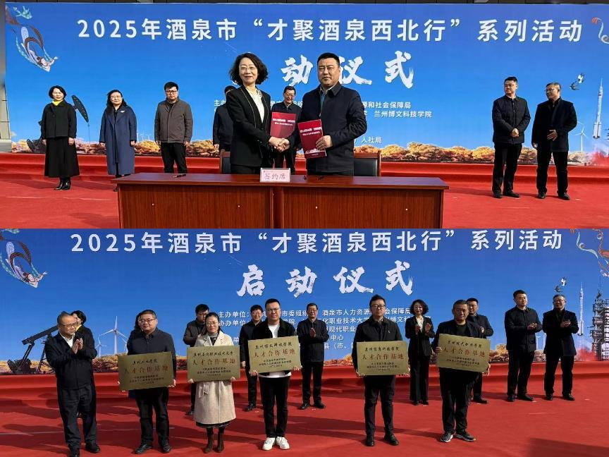 活动期间,酒泉市人社局与我校签署政校人才合作框架协议,并进行人才合作基地授牌仪式。双方就未来的合作方向和具体计划进行交流,并达成多项共识。酒泉市人社局为学校酒泉籍优秀学生代表颁发聘书。
