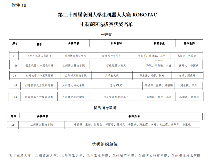 近日,甘肃省教育厅公布了2024年下半年省级大学生学科专业竞赛获奖名单。其中,机电工程学院在第二十四届全国大学生机器人大赛ROBOTAC甘肃赛区选拔赛中表现出色,成绩斐然。