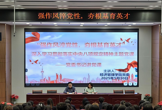 为进一步加强党风廉政建设,强化党员的纪律意识和规矩意识,经济管理学院于5月30日在综合教学楼召开了“‘强作风淬党性,夯根基育英才’深入学习贯彻落实中央八项规定精神主题党课——党委书记讲党课”会议。会议由经济管理学院党委书记张利和学生党员工作站负责人谭成杰共同主持,全体党员参加了此次会议。