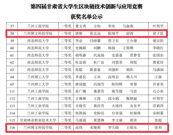 2024年11月30日,第四届甘肃省大学生区块链技术创新与应用竞赛在西北师范大学云亭校区圆满落幕。本次竞赛由甘肃省教育厅主办,西北师范大学承办,吸引了全省多所高校的学子参与。我院两支学生队伍凭借出色的表现与扎实的专业技能,分别荣获一等奖和二等奖,充分展示了我院在区块链技术创新与应用领域的强劲实力。