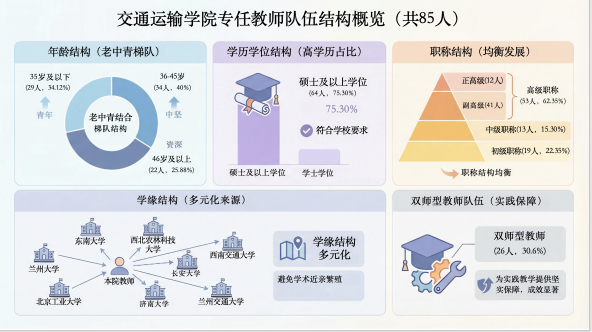 近年来学院不断扩大专任教师队伍总量,改善师资队伍的职称结构、学历结构、年龄结构、学缘结构,提高师资队伍整体素质,形成了一支学术水平高、教学经验丰富、结构合理、具有奉献精神的师资队伍,为学院人才培养提供了有利支撑。交通运输学院专任教师共计85名。具有硕士及以上学位的教师64人,占比75.30%。具有高级职称的教师53人,占比62.35%。学缘结构上,专任教师毕业于兰州大学、东南大学、西南交通大学、北京工业大学、长安大学、兰州交通大学等国内知名院校,学缘结构多元化。