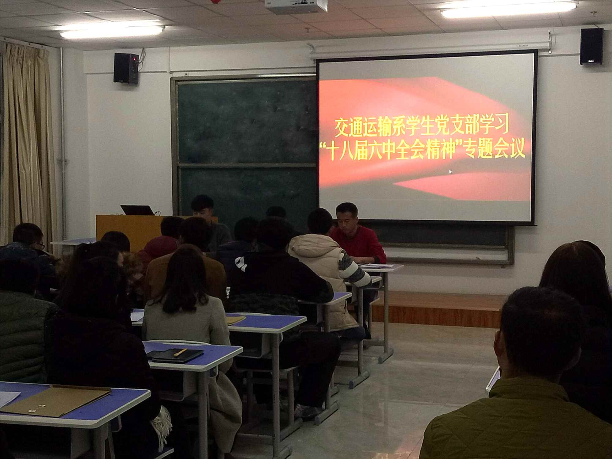交通运输系学生党支部于2016年11月27日下午19:30在北校区教学楼0801教室组织召开全体学生党员及入党积极分子学习中国共产党第十八届六中全会精神专题会议。