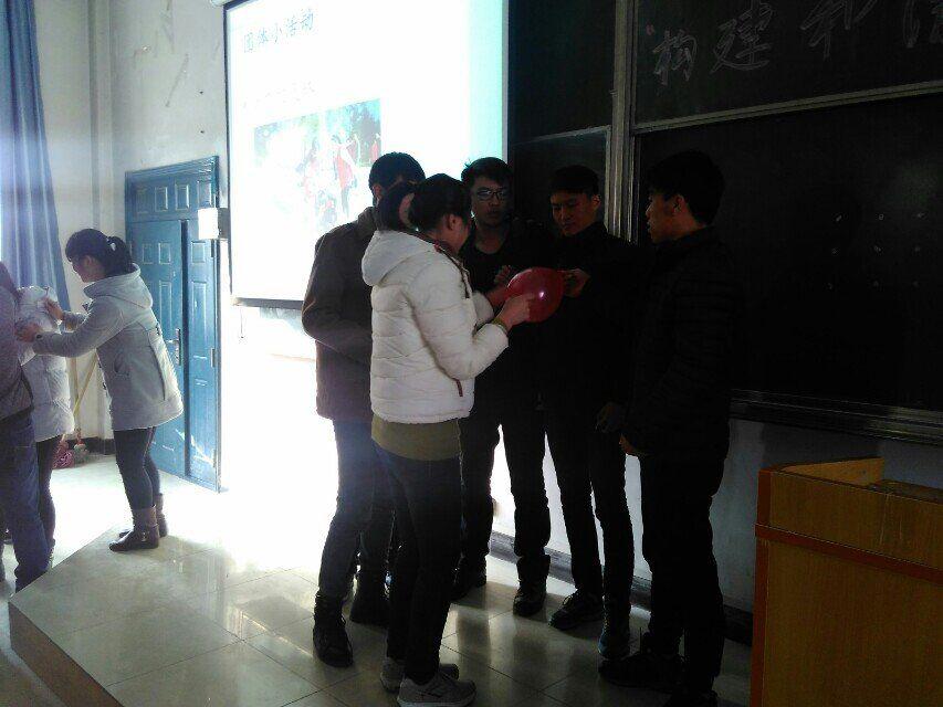 随后,蔡老师邀请大家来玩一个吹气球的游戏,一共有三组同学,每组五人,每个人都有自己不同的分工,然后三组同学进行比赛,看哪组同学能最快的完成任务。游戏欢乐而有序的进行,大家也都有自己的感想。通过这次的游戏,让大家认识到了一个很平常,又很重要的一个道理——团结,合作。