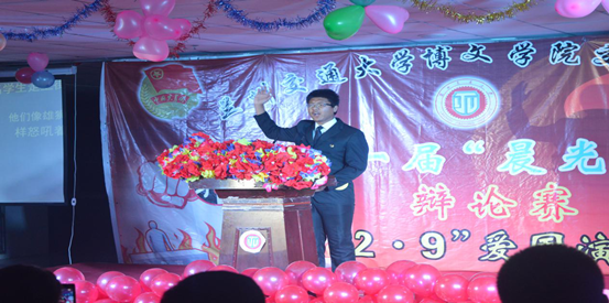 为了纪念“一二·九”爱国运动八十周年,牢记“一二·九”运动,增强当代大学生的爱国情怀,丰富校园生活,提升学生文学功底。兰州交通大学博文学院交通运输系于2015年12月7日20:30在北校区大学生活动中心举办了第一届“一二·九”爱国演讲总决赛,莅临本次比赛的嘉宾有交通运输系主任谢利民、学生处副处长王俊鹏、土木工程系学生管理副主任张宏亮、电信工程系学生管理副主任柴明喜、交通运输系学生管理副主任梁婷婷、交通运输系辅导员蔡虹、刘佳、陈江明老师以及各系团总支学生会负责人。
