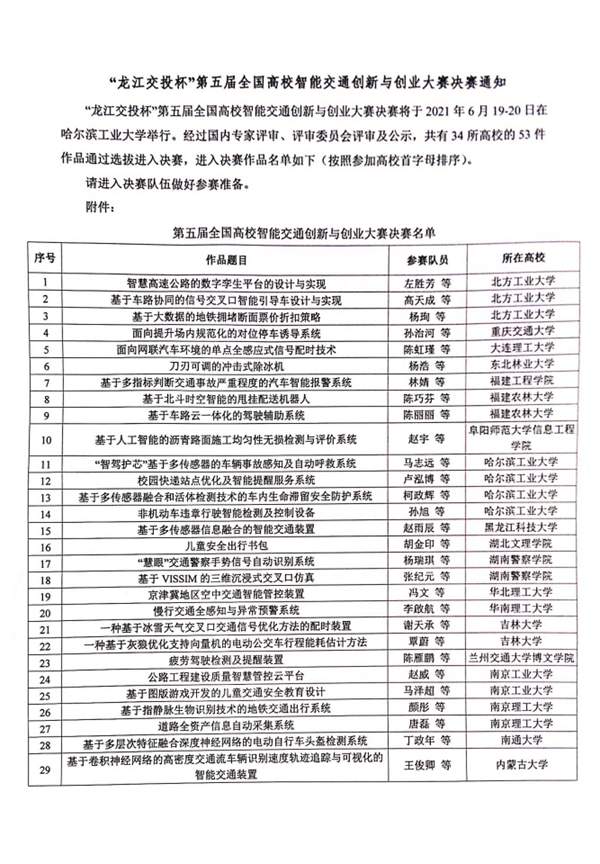 本次大赛通过初赛,共有哈尔滨工业大学、吉林大学、大连理工大学、华南理工大学等34所高校53支队伍进入全国总决赛。大赛以“智领交通·创想未来”为主题,聚焦“智慧交通”、“车路协同”、“自动驾驶”、“交通安全”,大赛通过初赛和决赛让更多的高校学生加入到智能交通事业中,融入交通强国战略中来。