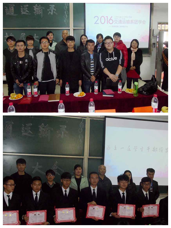 随着一段关于交通运输系团学会的介绍宣传片我们正式走进了交通运输系团学会,由此换届大会正式拉开帷幕。首先,由主持人张翔宇介绍了莅临本次大会的领导、老师及嘉宾。紧接着由学生管理副主任梁婷婷老师和教学管理副主任刘影老师分别对团学会的工作进行总结,梁婷婷老师在会议中将上一学年交通运输系所获得的辉煌佳绩作简述,并对以后的工作提出了建议,希望每一个团学会成员都能树立服务意识,力争做到专注与卓越。刘影老师提出团学会的干部不仅要在工作中起到模范带头作用,在学习中也要起到带头作用,带动我系的学风建设。随后由团总支常务副书记代臻和学生会主席侯海东分别做述职报告,他们分别对上学年的工作进行了总结,希望新一届主席团成员能够“在其位,谋其政,担其责”,并通过携手合作,把团学会越办越好。他们对每一个团学会成员都寄予厚望,希望每个人都要有责任、服务、奉献的意识。其次,由辅导员陈江明老师宣布了新届团学会干部名单,并由新届团学会常务副书记郑志伟和学生会主席马金强分别做就职报告,他们以最大的热情,表达了为团学会付出的决心。伴随着一阵激动人心的乐章,领导为团学会干部颁发聘书,聘书说明他们的努力与汗水得到了领导和老师的认可。最后,由系主任谢利民教授做大会总结,谢主任讲到,成功的背后付出的是汗水,预祝所有团学会成员在今后的工作中齐心协力,再创佳绩!大会临近尾声,在场领导、老师以及所有团学会干部上台合影留念,为这激动人心的一刻印上深深地烙印。