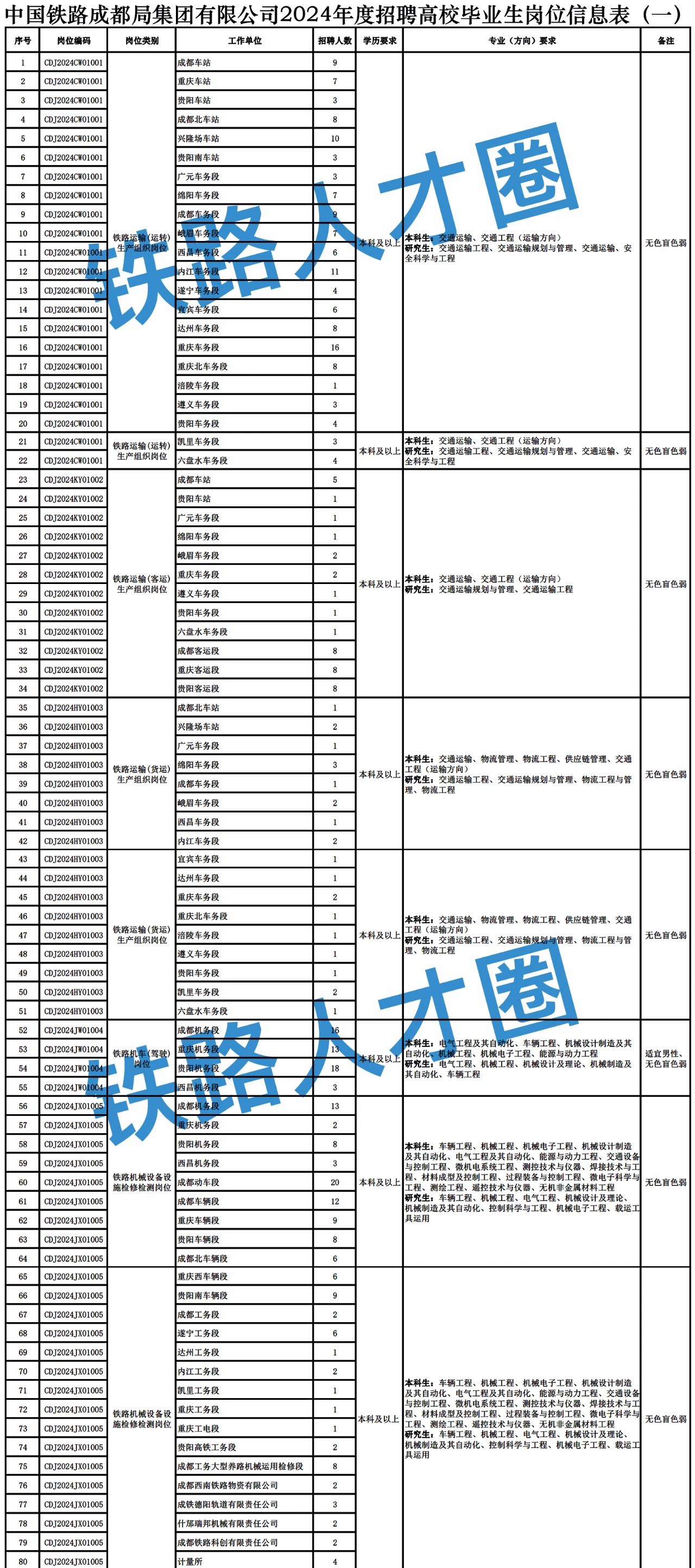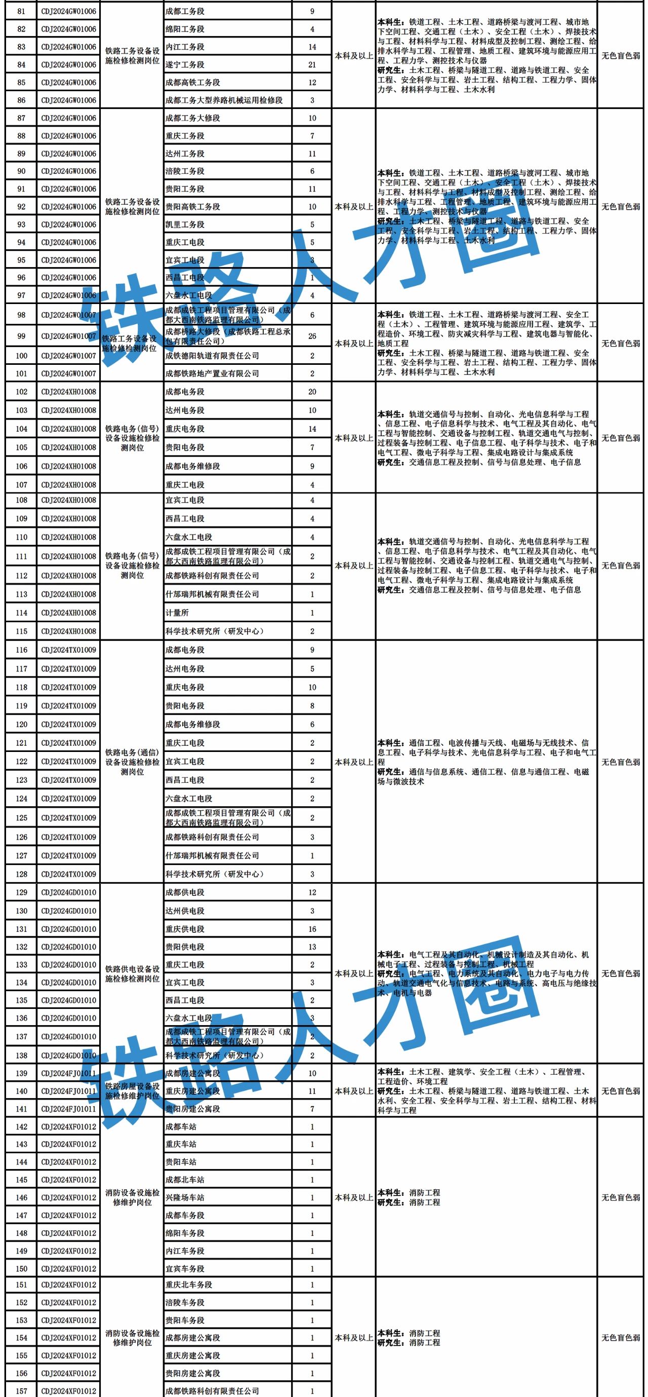 4.身心健康,具有良好的心理素质,部分岗位要求无色盲色弱,具备正常履行岗位职责的身体条件,符合招聘岗位职业健康规范标准。其中岗位编码为CDJ2024JW01004岗位,要求身体条件符合《铁路机车乘务员职业健康检查规范》(TB/3091-2019)规定标准。