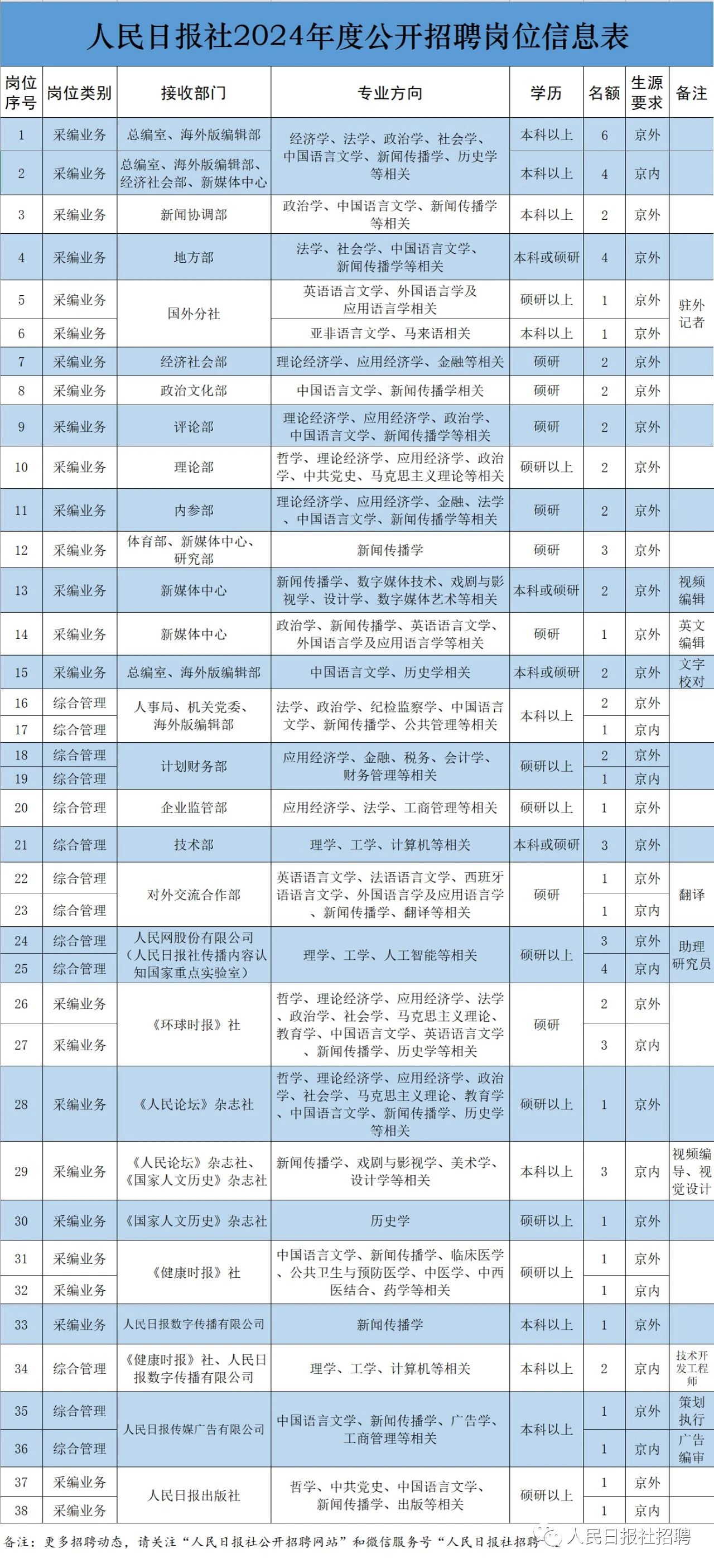 根据事业发展需要,人民日报社2024年度面向国内高校应届毕业生和海外留学归国人员公开招聘工作人员74名。现将有关事项公告如下。