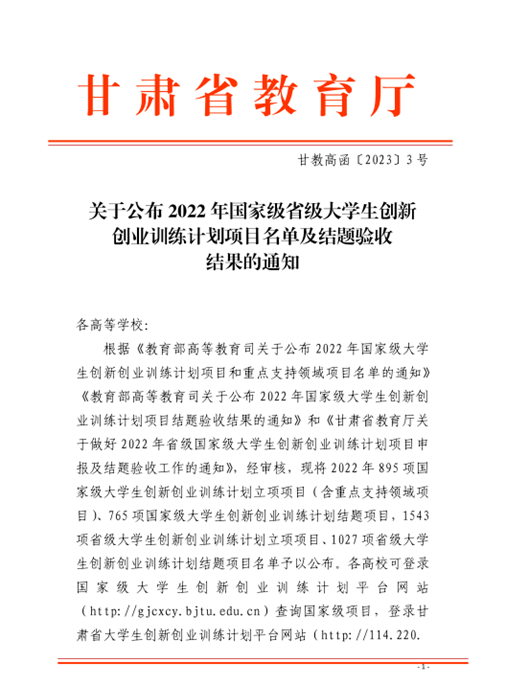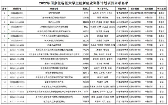 近日,甘肃省教育厅公布了2022年国家级省级大学生创新创业训练计划项目名单,我校20项项目获批立项,其中,国家级项目7项,省级项目13项。