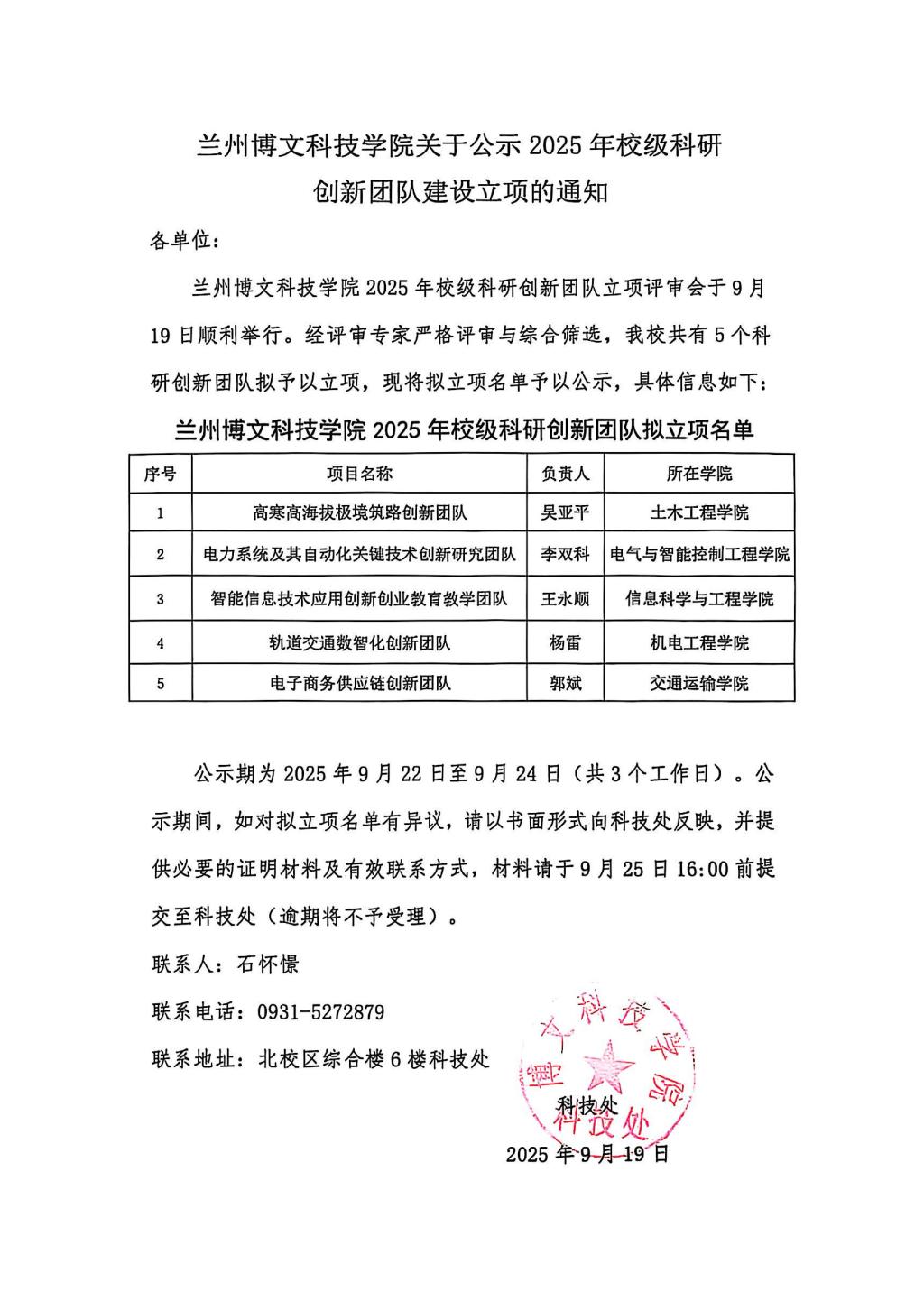 bat365正版唯一官网关于公示2025年校级科研创新团队建设立项的通知