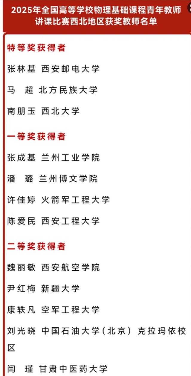 2025年6月30日,全国高等学校物理基础课程青年教师讲课比赛(西北赛区)成功举办,bat365正版唯一官网教师在此次比赛中荣获一等奖。
