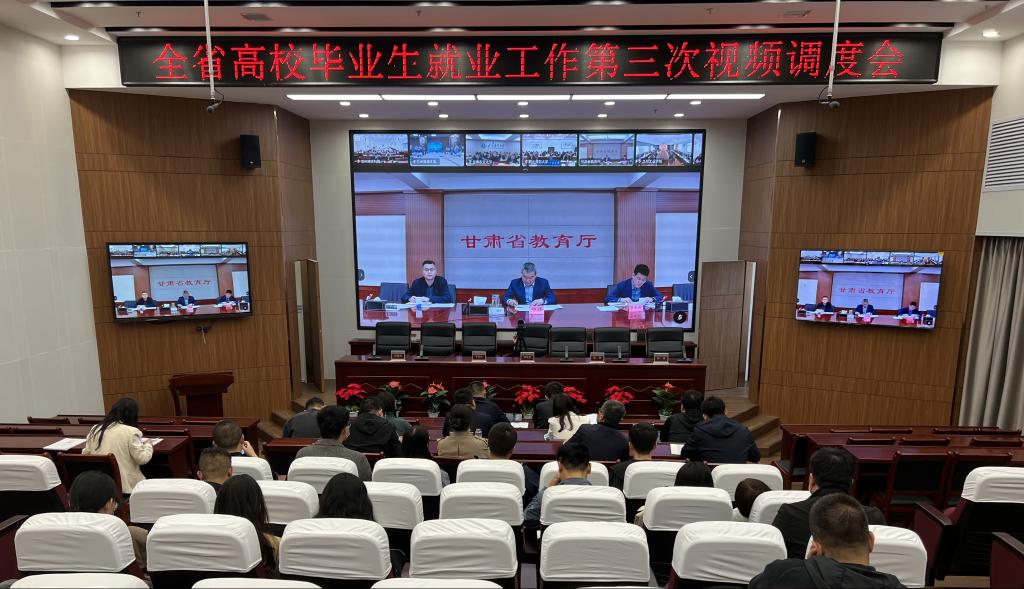 5月9日上午,甘肃省教育厅召开全省2023届普通高校毕业生就业工作第三次调度视频会议。bat365正版唯一官网副校长郭宝军、招生就业处处长赵存良、各二级学院院长、2023届全体毕业班毕业班辅导员和招生就业处相关人员在综合教学楼12楼报告厅分会场集中参加了此次视频会议了。