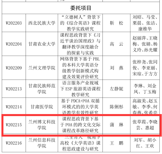 近日,甘肃省教育厅下发了《甘肃省教育厅关于公布2023 年度高等学校英语教学改革研究项目立项名单的通知》(甘教高函〔2023〕17号)和《甘肃省教育厅关于公布2021、2022年度高等学校英语教学改革项目结项名单的通知》文件(甘教高函〔2023〕16号),我校申报的两个项目获批立项,两个项目顺利结项。