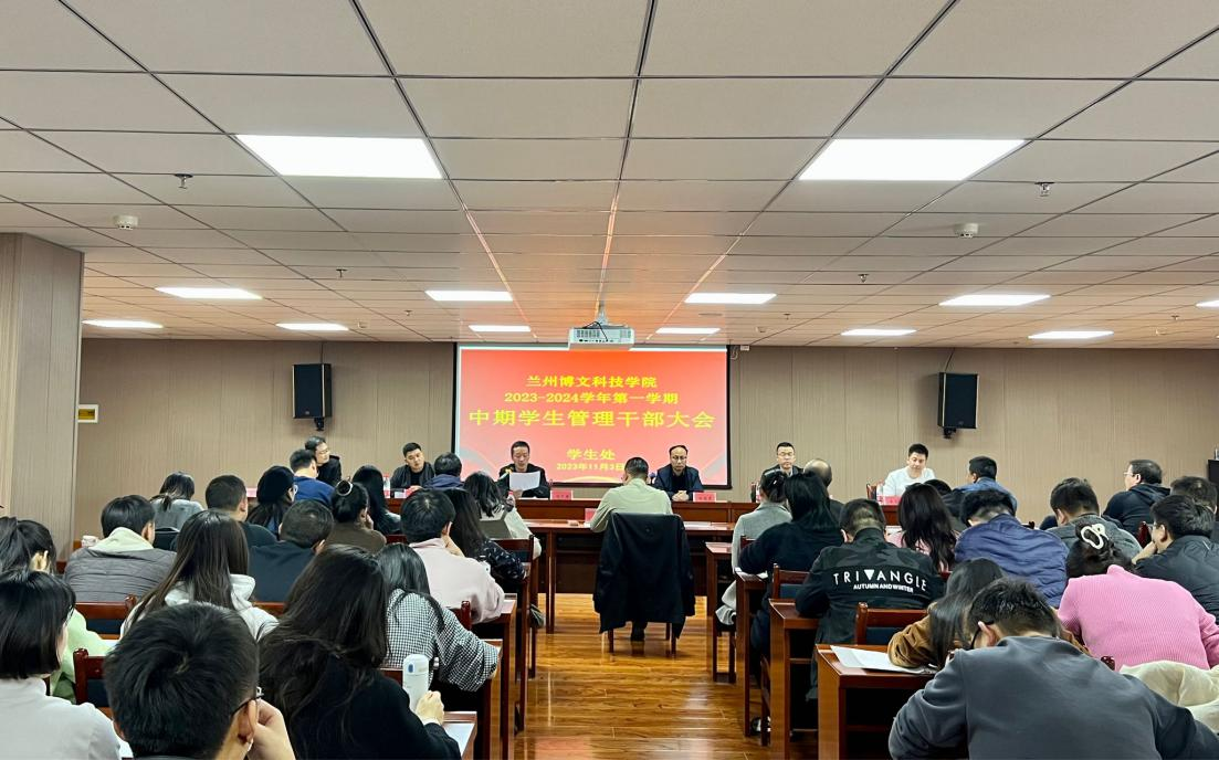 为切实提升学校学生管理干部的工作能力和管理水平,进一步加强学生管理干部队伍建设,11月3日下午14:50,学校中期学生管理干部大会在培训楼8楼报告厅召开。副校长刘德光、学生处处长刘秀星、校团委书记丁旭强、学生处副处长王立童、学生处副处长王正茂、各学院主管学生工作副院长、全体辅导员及班主任参加会议。会议由学生处副处长刘广魁主持。