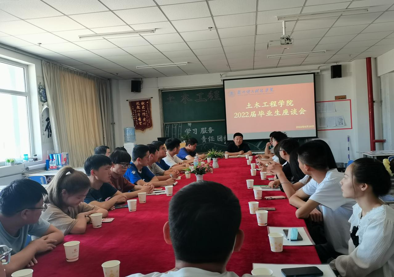 2022届毕业生即将离开母校,开启新的人生征程,为表达对毕业生们的美好祝福以及听取同学们对学院发展建设的建议,土木工程学院于2022年6月16日在综合教学楼1107教室召开了2022届毕业生座谈会。参加座谈会的有土木工程学院院长黄钰峰,学生管理副院长巩岩,辅导员杨金星、梁逸兰以及2022届毕业生代表。
