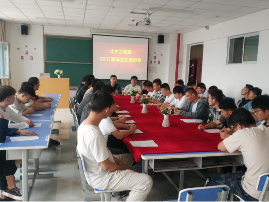 为了进一步了解毕业生的就业、学习和生活情况,掌握毕业生的思想动态,更好地开展毕业生教育、管理和服务工作。土木工程系于2021年6月16日上午10:30,在北校区综合教学楼1007室举行2021届毕业生座谈会。土木工程系主任黄钰峰、教学管理副主任叶国仁、学生管理副主任巩岩、辅导员杨金星以及大四各班学生代表参加了本次座谈会。