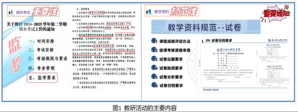 活动伊始,教研室主任强调了期末考试工作对于检验教学成果、保障教学质量的重要意义,着重对教师监考工作进行详细部署。要求全体监考教师严格遵守监考纪律,明确监考职责,规范监考流程,做到考前仔细检查考场环境、核对学生身份信息,考中认真巡查、杜绝作弊行为,考后妥善整理试卷,以严谨的态度为学生营造公平公正的考试环境。