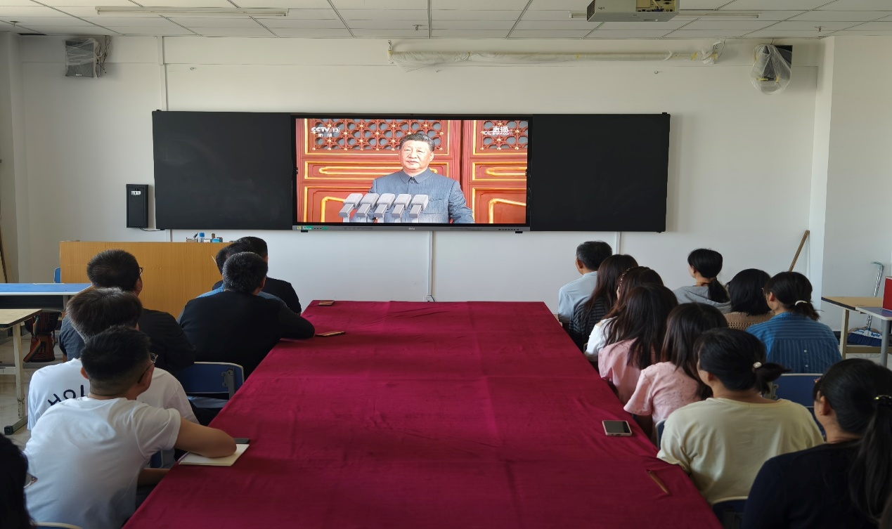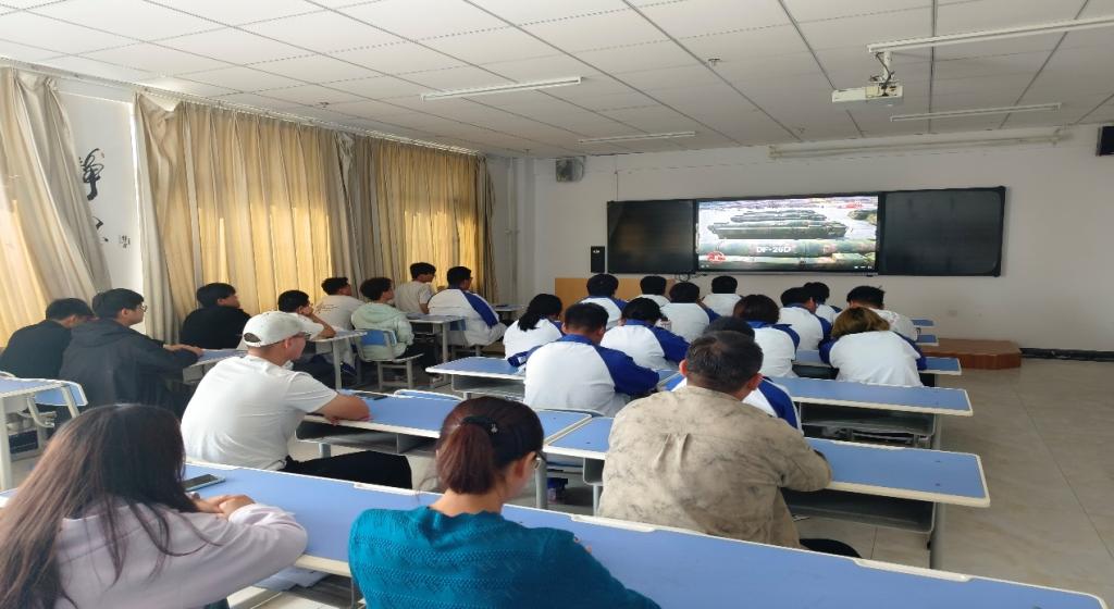 阅兵仪式上,整齐划一的徒步方队、威武雄壮的装备方队、翱翔天际的空中梯队依次通过天安门广场,展示了我国强大的国防力量和军队现代化建设的伟大成就。师生专注地观看每一个画面,被受阅部队的英姿飒爽和昂扬士气所震撼,不时爆发出热烈的掌声。