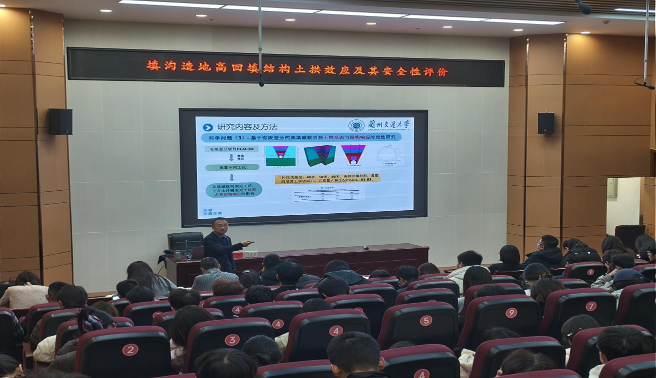 讲座中,李盛教授结合“一带一路”战略背景下中西部黄土地区工程建设现状,系统分析了黄土高原“千沟万壑、山多地少”的地理特征,指出土地资源紧缺已成为制约城市建设与交通枢纽发展的核心瓶颈,而填沟造地过程中产生的高填方明洞结构,面临着土压力传递复杂、长期稳定性不足等关键问题。他强调,高回填结构中减载措施引发的土拱效应,受土体长期蠕变影响具有明显时效特征,直接关系到结构受力的动态调整,其安全性评价是保障工程长期稳定的核心课题。