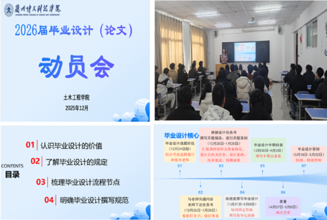 本次系列动员大会由各教研室主任及专业指导教师分别主持。会上,主讲教师围绕学院毕业设计(论文)实施方案、管理规定及撰写规范展开详细宣讲,通过展示历届优秀成果,为同学们提供直观参考;同时通报2025届工作总结与改进要求,重点强调学术诚信底线,明确禁止抄袭、买卖、替做等学术不端行为,引导同学们树立严谨治学态度。