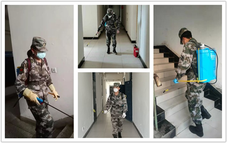 八一学社成员每天坚持按照高标准、严要求、全方位地在学校进行消毒防控义务。时刻保持最饱满的战斗状态为我校各个角落,不留死角,不留盲区进行全面的消毒工作。攻打并一直坚守着每一方安全可靠的正义领地。八一学社成员蔡云说:“作为一名退伍军人大学生,虽然已离开部队,但依然要保持军人的气概和担当。”简单朴实的话语,展现出他们大爱无疆,担当有为,无私奉献的精神面貌,彰显了新时代青年的责任和担当。