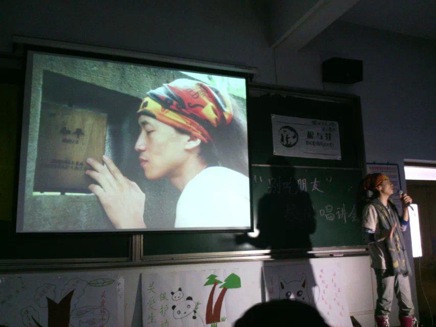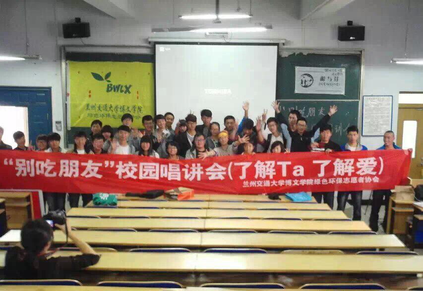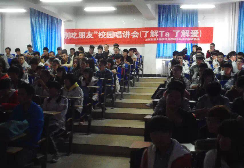2014年10月27日,兰州交通大学博文学院绿色环保志愿者协会邀请解征老师到博文学院开展“别吃朋友”主题唱讲会,参加活动的人数多达200多人。