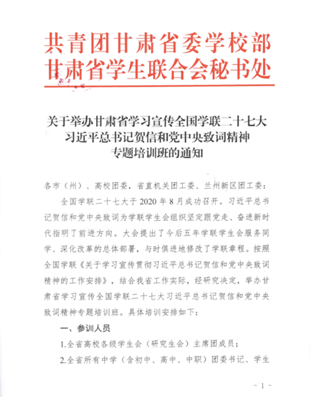 关于举办甘肃省学习宣传全国学联二十七大习近平总书记贺信和党中央致词精神专题培训班的通知