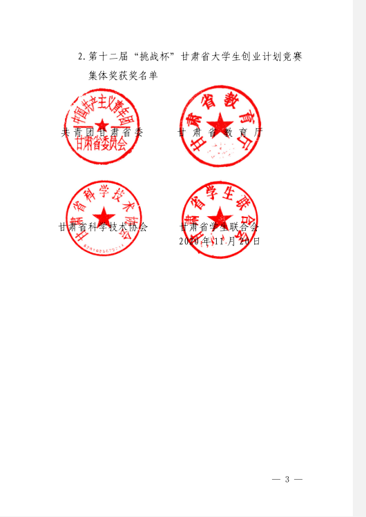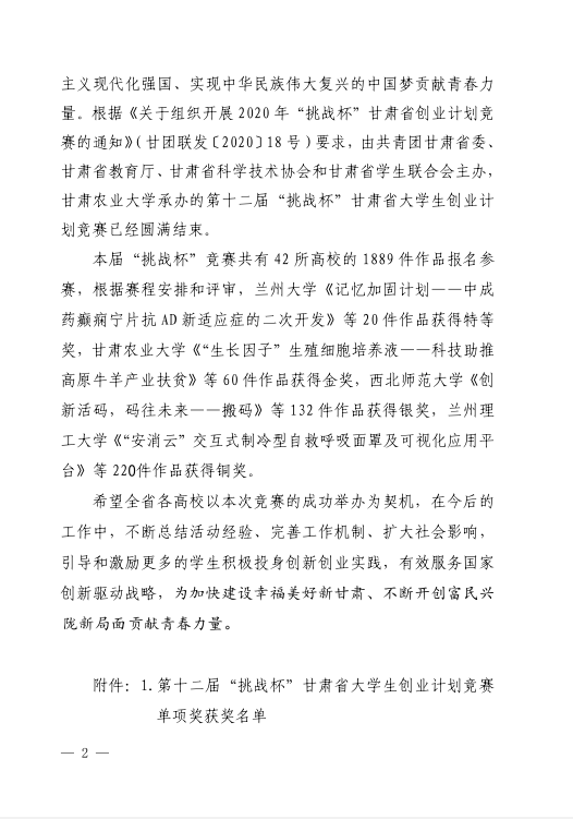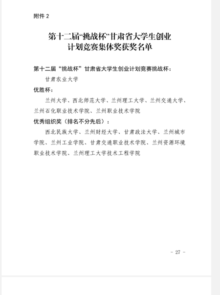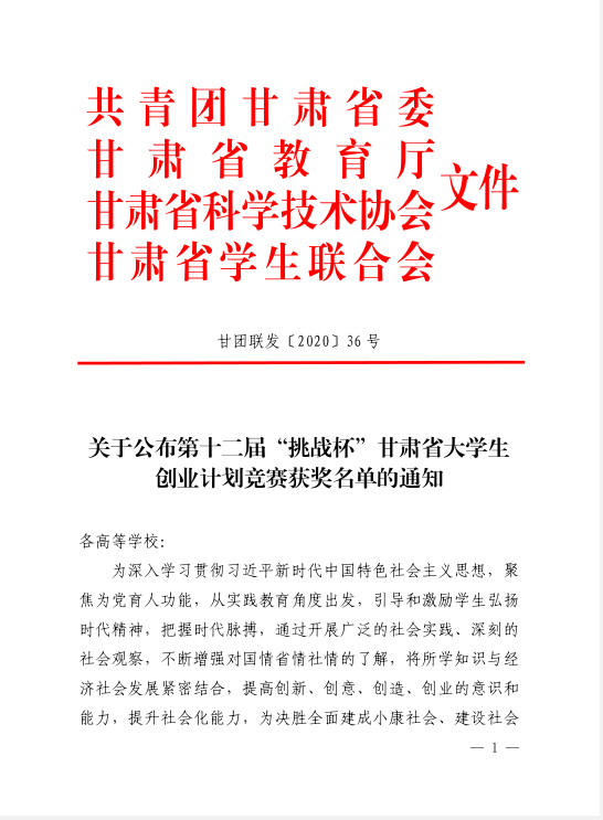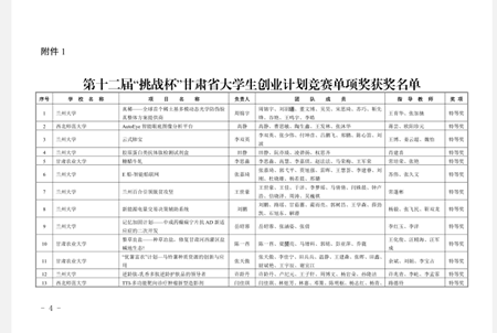 关于公布第十二届“挑战杯”甘肃省大学生创业计划竞赛获奖名单的通知