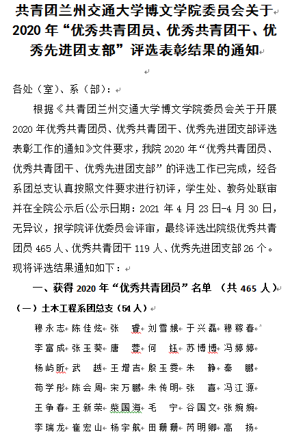 共青团兰州交通大学博文学院委员会关于 2020年“优秀共青团员、优秀共青团干、优秀先进团支部”评选表彰结果的通知