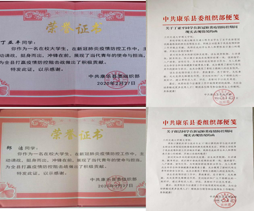 新冠肺炎疫情发生后,兰州交通大学博文学院460余名学子主动投身家乡打赢疫情防控阻击战中,多措施保障安全,协力帮助政府做好各项应对工作。学院17级计算机科学与技术班郎洁同学、19级交通工程班丁亚平同学,充分发挥当代大学生使命与担当自愿参加家乡志愿者工作。负责协助调查小区外来人员、在社区发放通行证、采集小区人员出行情况。虽然岗位很普通、很平凡,但是在抗击疫情的战线上离不开志愿者们无私的奉献!这两位同学受到中共康乐县委组织部的表彰,充分展现了新时代有志青年的使命与担当,也充分展现了我院立德树人的优良校风。