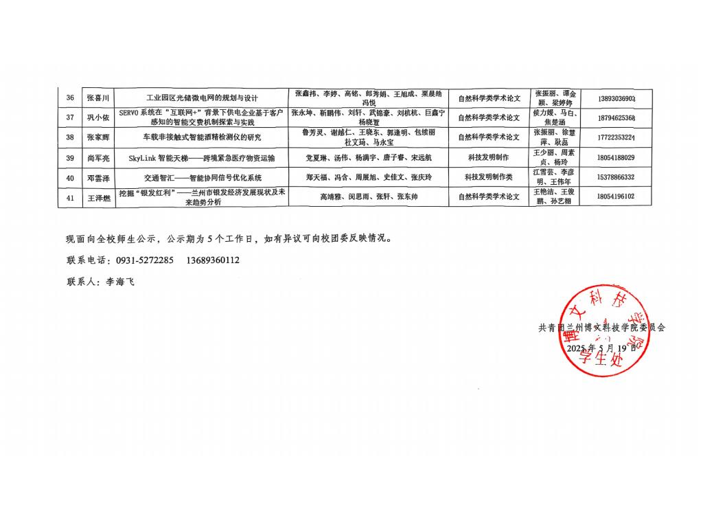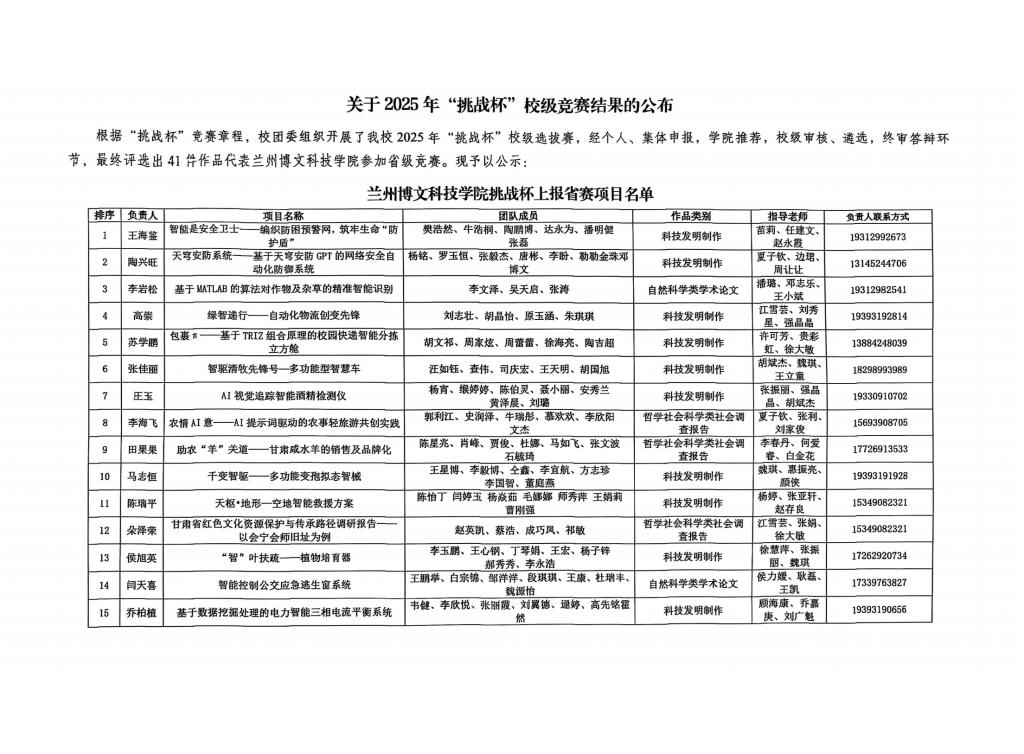 2025年第十五届“挑战杯”甘肃省大学生课外学术科技作品竞赛bat365正版唯一官网推报参加省赛项目公示