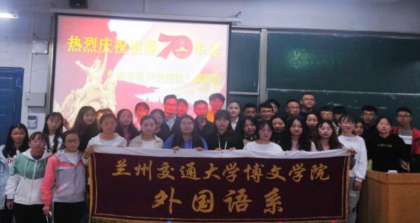 秋风送爽,瓜果飘香,在这个收获的季节里,我们迎来了祖国母亲的70华诞,在这个特别的日子里,外国语系于9月19日在学院南校区东T3成功举办了“热烈庆祝祖国70华诞–乘着歌声的翅膀”演唱会。参加本次活动的院领导及老师有兰州交通大学博文学院党委书记温晓光,外国语系辅导员王立童以及外国语系2018级全体学生。